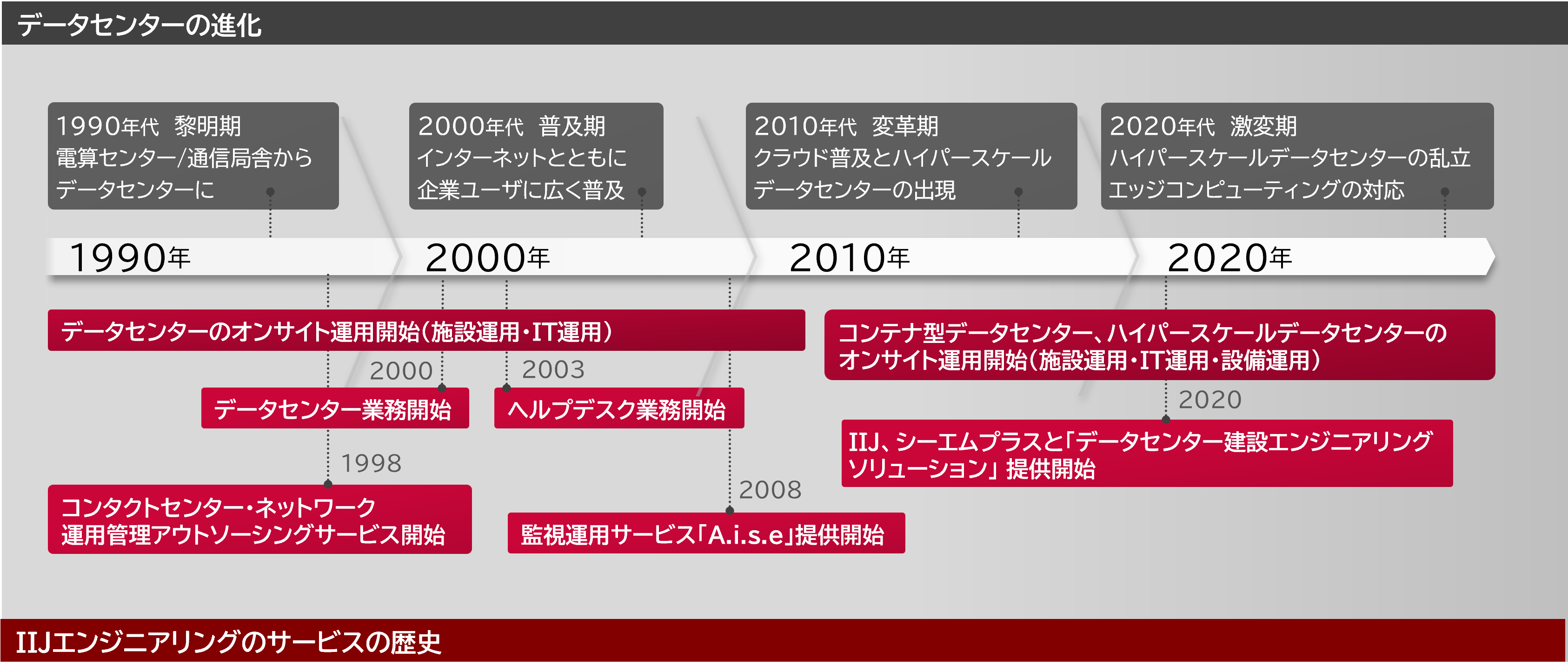 IIJエンジニアリングは、2000年よりデータセンター運用を開始し、施設、設備、ITに関わる運用において実績を重ねてきました。その知見を活かし、データセンターの設計から運用までのライフタイムに応じ多様なサービスを提供します。